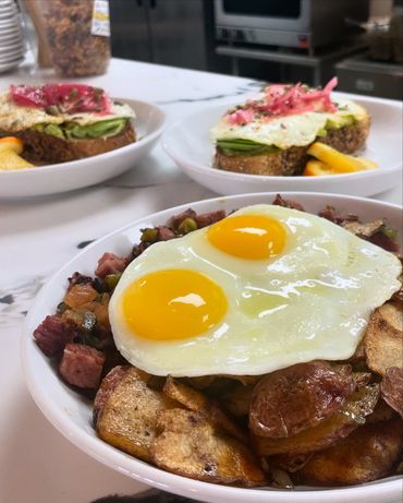 2 Eggs Any Style, Corned Beef Hash, Peppers, Onions, Tomato, Toast, House Potatoes