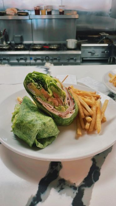 Honey Turkey, Bacon, Romaine, Tomato, Avocado, Herb Mayo, Spinach Wrap, House Fries. Try as a Sandwich!