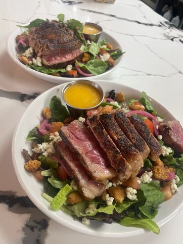 USDA Choice Black Angus 6 oz NY Steak, Romaine, Black Bean Corn Salsa, Cheddar Cheese, Chipotle Caesar Dressing, House Fries