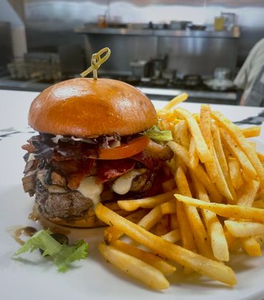 8oz Beef Patty, Bacon, Mushroom, Mixed Greens, Herb Mayo, Swiss Cheese, Tomatoes, Pickled Onion, Brioche Bun, House Fries